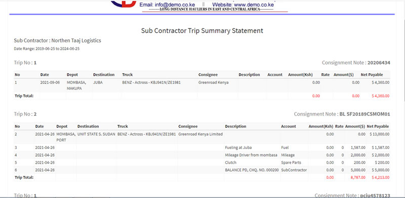 In case of a sub-contractor, the system can generate the sub-contractor trip summary statement displaying all the trips booked for the trucks owned by the sub-contractor and the amount due to him. The trip summary statement can also be filtered per single truck or the date range.