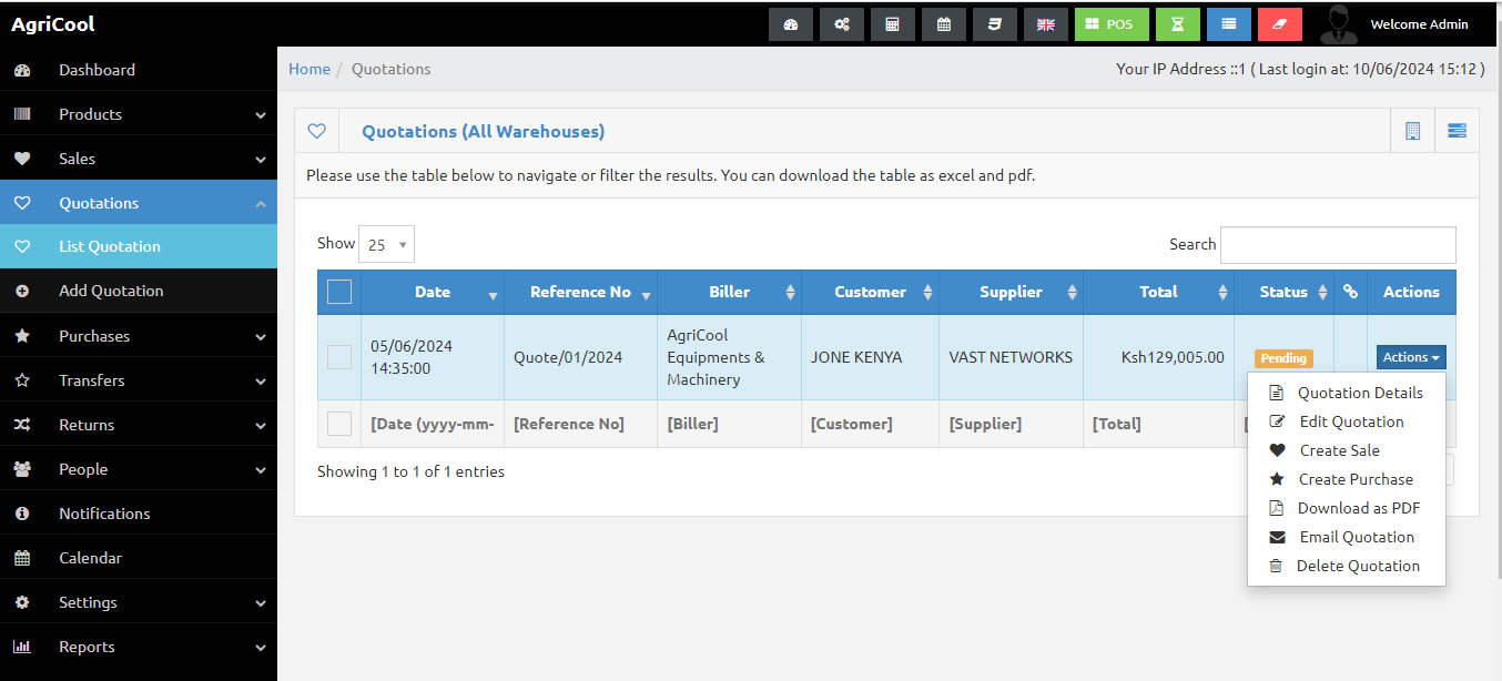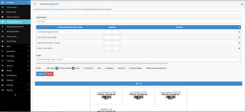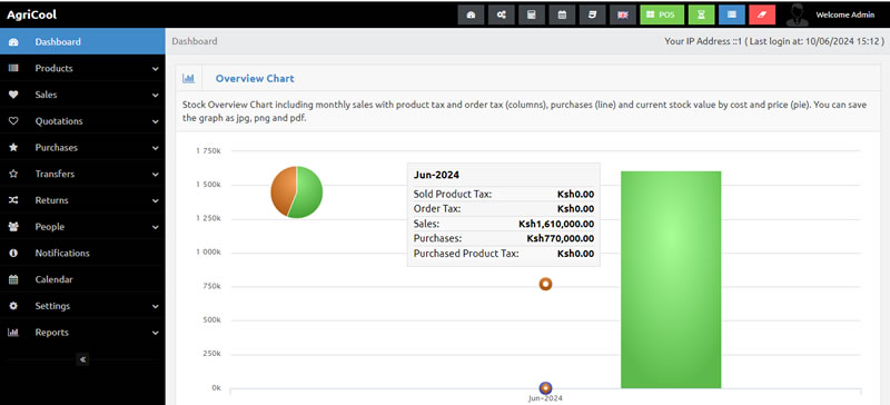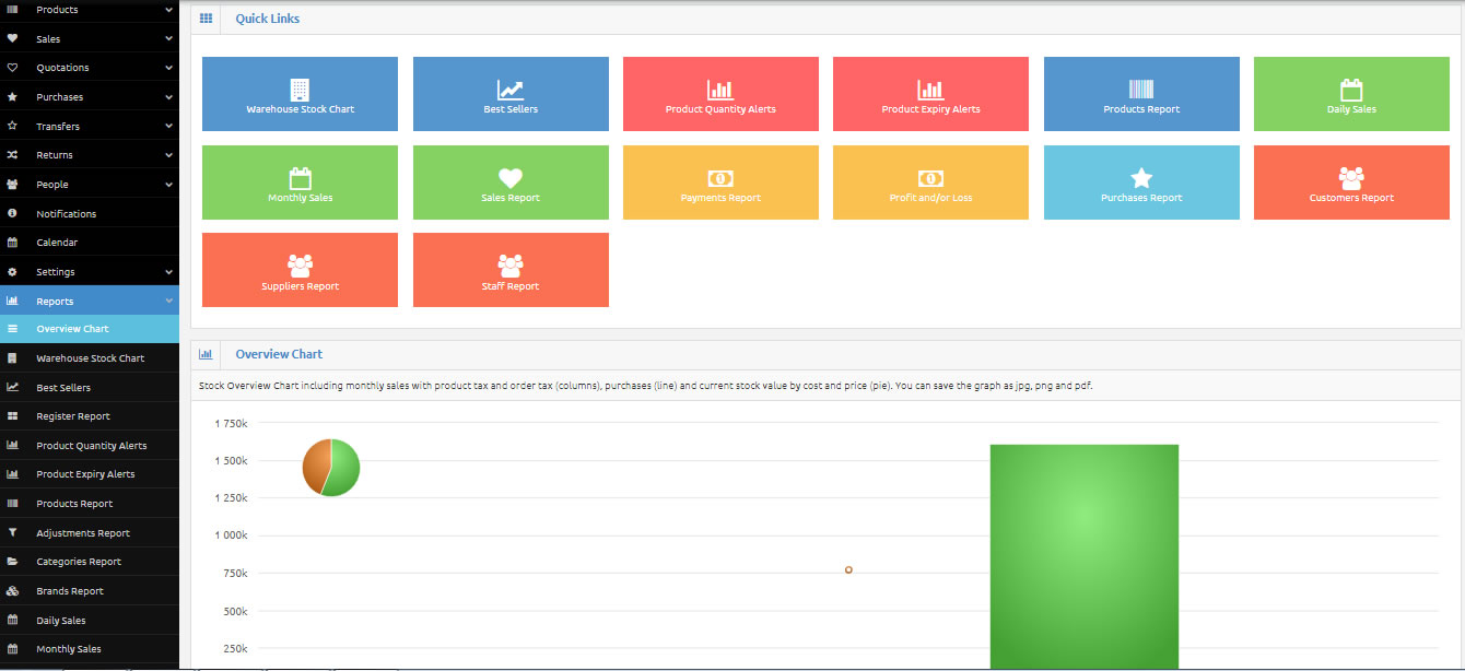 o Comprehensive dashboard with charts for sales, purchases, quotations, transfers, customers, and suppliers.